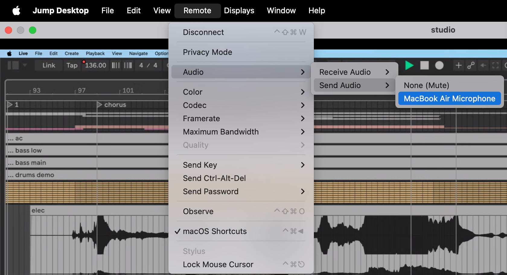 The Jump Desktop app itself offers one: since we’re transmitting wireless video one way, why not send your MacBook Air’s microphone feed the other direction? This is a tantalizing idea that turns out to be an easy add-on. With a bit of setup, the microphone you’ve got on your wireless laptop now can show up as an input in your studio.