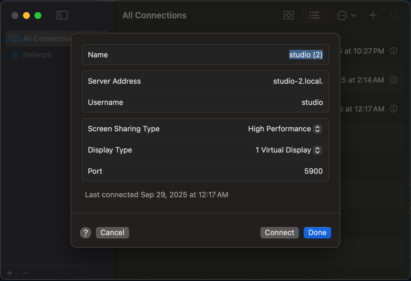 For the longer story, I must mention the High Performance Screen Sharing Mode that, as of Sonoma, is now baked into MacOS. That update first made me realize this could be done. Before Sonoma, screen sharing was cumbersome: the computer’s resolution was often not scaled correctly, latency was sluggish, and color accuracy was pretty lackluster.